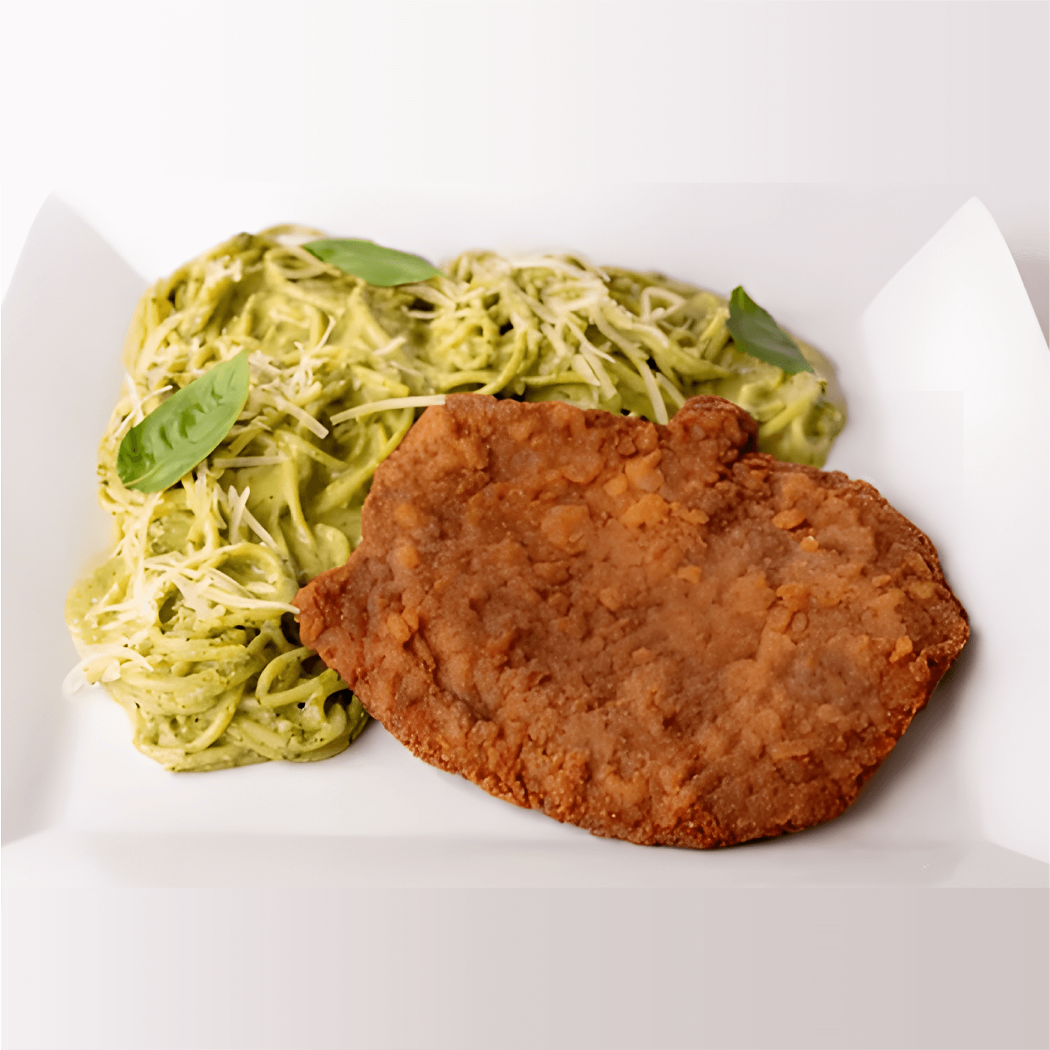 Milanesa de carne dorada y crujiente, preparada con cortes seleccionados y empanizado artesanal, servida junto a spaghetti al pesto fresco. La pasta se envuelve en una salsa verde intensa, hecha con albahaca, ajo, nueces y aceite de oliva, aportando aroma y cremosidad. El contraste entre la textura crocante de la carne y la suavidad herbal del pesto crea un plato reconfortante, equilibrado y lleno de sabor para disfrutar en familia.