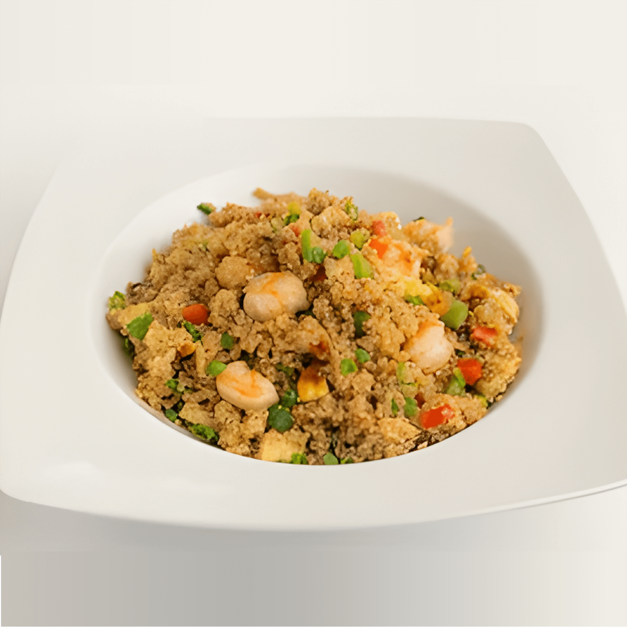 Quinua salteada al wok con vegetales frescos, langostinos jugosos y aromas orientales suaves