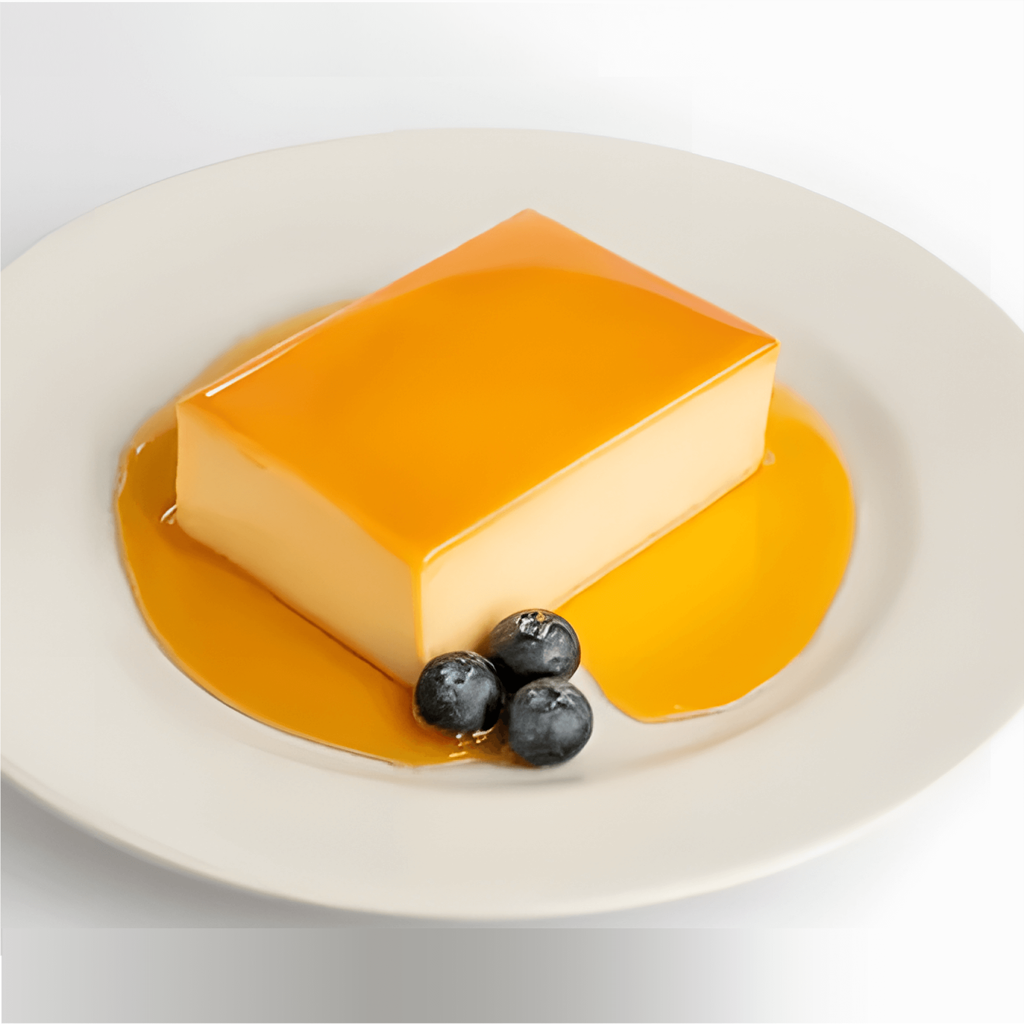 Flan clásico de vainilla acompañado de miel de caramelo, textura firme y cremosa.