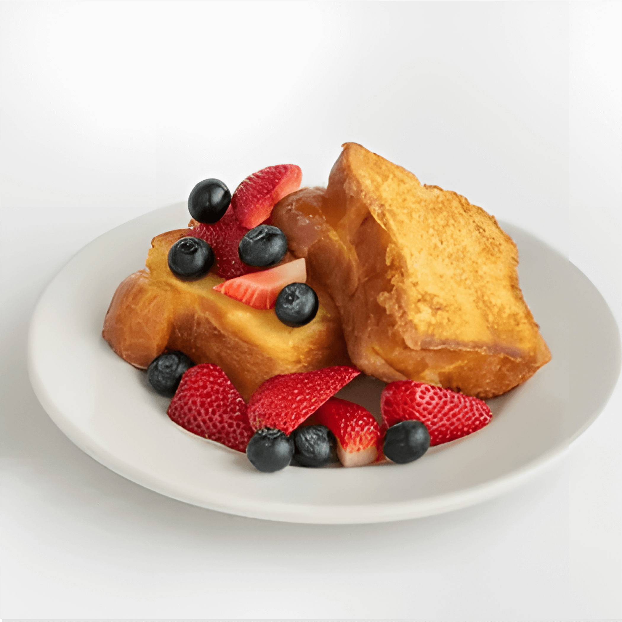 Pan brioche dorado a la plancha, suave y crujiente. Se perfuma con canela y vainilla, y se termina con un toque de miel que realza su dulzura. Acompañada de frutas frescas, como fresas y arándanos, y se agrega un huevo cocido a tu gusto, ya sea frito o revuelto, balanceando la dulzura. Una mezcla perfecta de texturas y sabores que forma una opción ideal para un desayuno o brunch reconfortante.